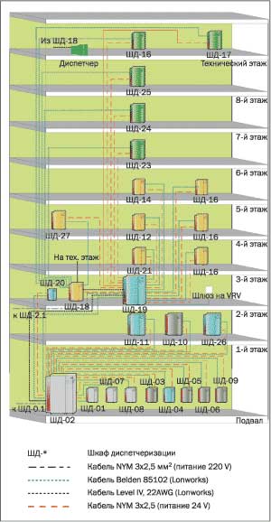 Като протокол за системи за автоматизация на сгради е избран открит на стандарта LonWorks с прилагането на свободно програмируеми контролери NetLon MB-2 (фиг. 2) производството на Lexel, об'обединени в мрежата, има свободна топология. Сегменти на мрежата за'се свързват помежду си с високоскоростни магистральными гуми през роутеры LPR-12 компании Echelon. Устройства, които не поддържат протокол LonWorks, включени в системата, използвайки межсистемных портали протокольного ниво.